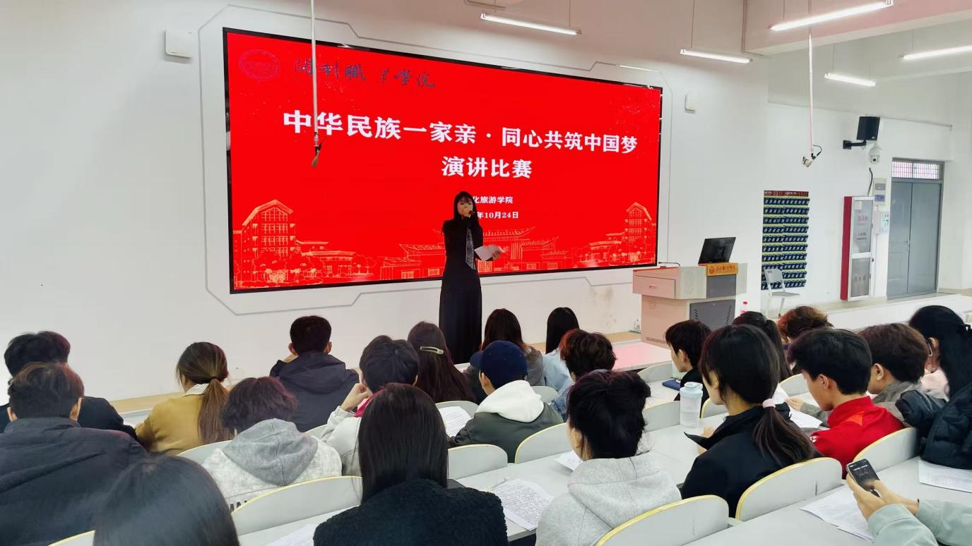 为深入学习贯彻中央民族工作会议精神,牢牢把握“铸牢中华民族共同体意识”主线,引导广大师生践行“四个共同”中华民族历史观,10月24日下午,文化旅游学院在希文楼阶梯教室成功举办“中华民族一家亲·同心共筑中国梦”主题演讲比赛。26名参赛选手同台竞技,文化旅游学院学生党支部宣传委员王恒老师担任本场比赛主持人兼评委老师,各班学生代表到场观赛。
