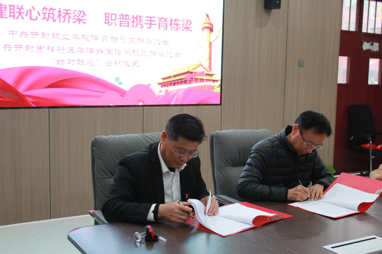 为创新基层党建模式,探索职普教育融合新路径,11月7日下午,开封职业学院体育部党总支与开封市华洋外国语学校党支部“结对联建”启动仪式在华洋外国语学校成功举行。此次活动旨在通过职普携手,构建“资源共享、优势互补、互相促进、共同提高”的党建工作新格局,共同为培育时代新人贡献力量。